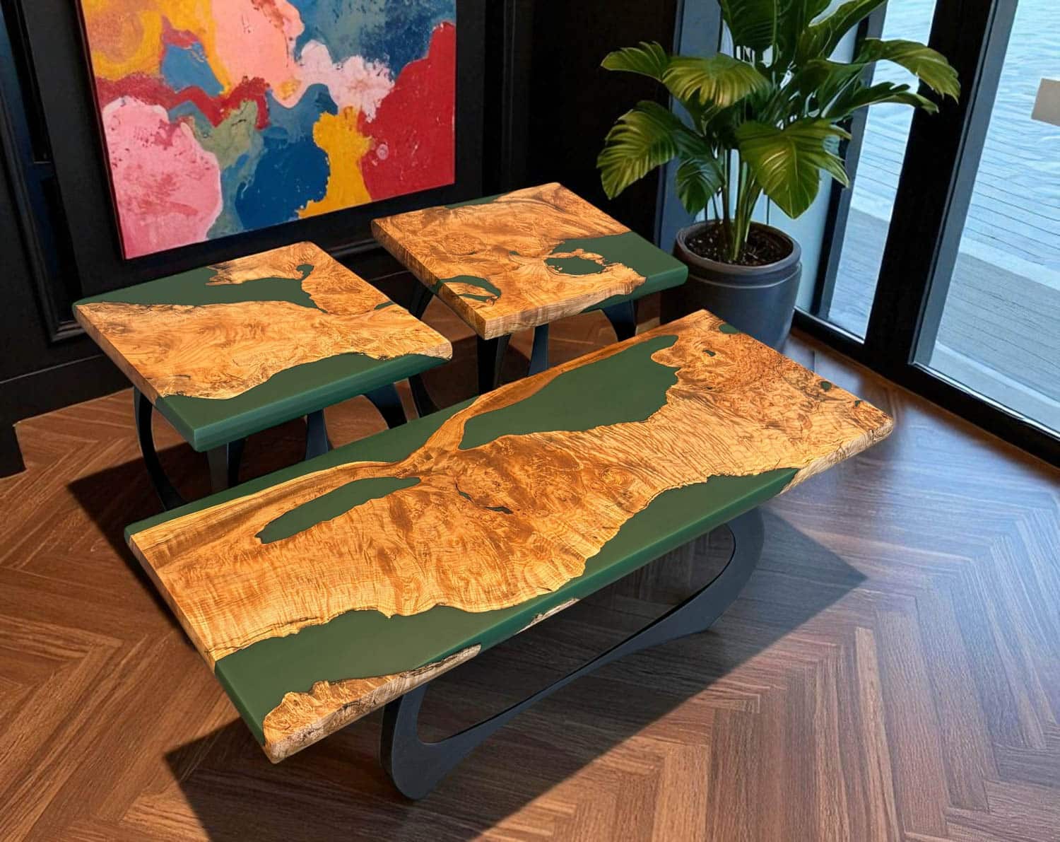 Crafted from exquisite Big Leaf Maple slabs, this matching table set showcases captivating figure and vibrant spring green epoxy inlays. Stabilized with clear epoxy and finished with hard wax oil and a ceramic coating, these tables offer both durability and sophistication. Supported by sleek mid-century modern bases, they blend natural beauty with contemporary design.